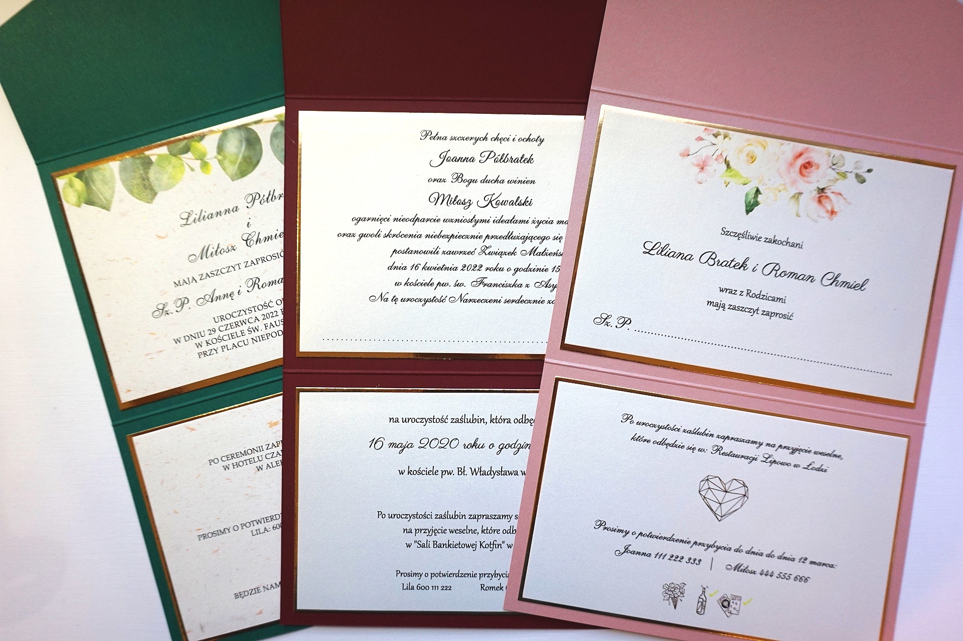 Ostatnie trendy obejmują zaproszenia z geometrycznymi wzorami, takimi jak trójkąty, sześciokąty lub linie, kwadraty itp. To może nadać zaproszeniom nowoczesny wygląd.