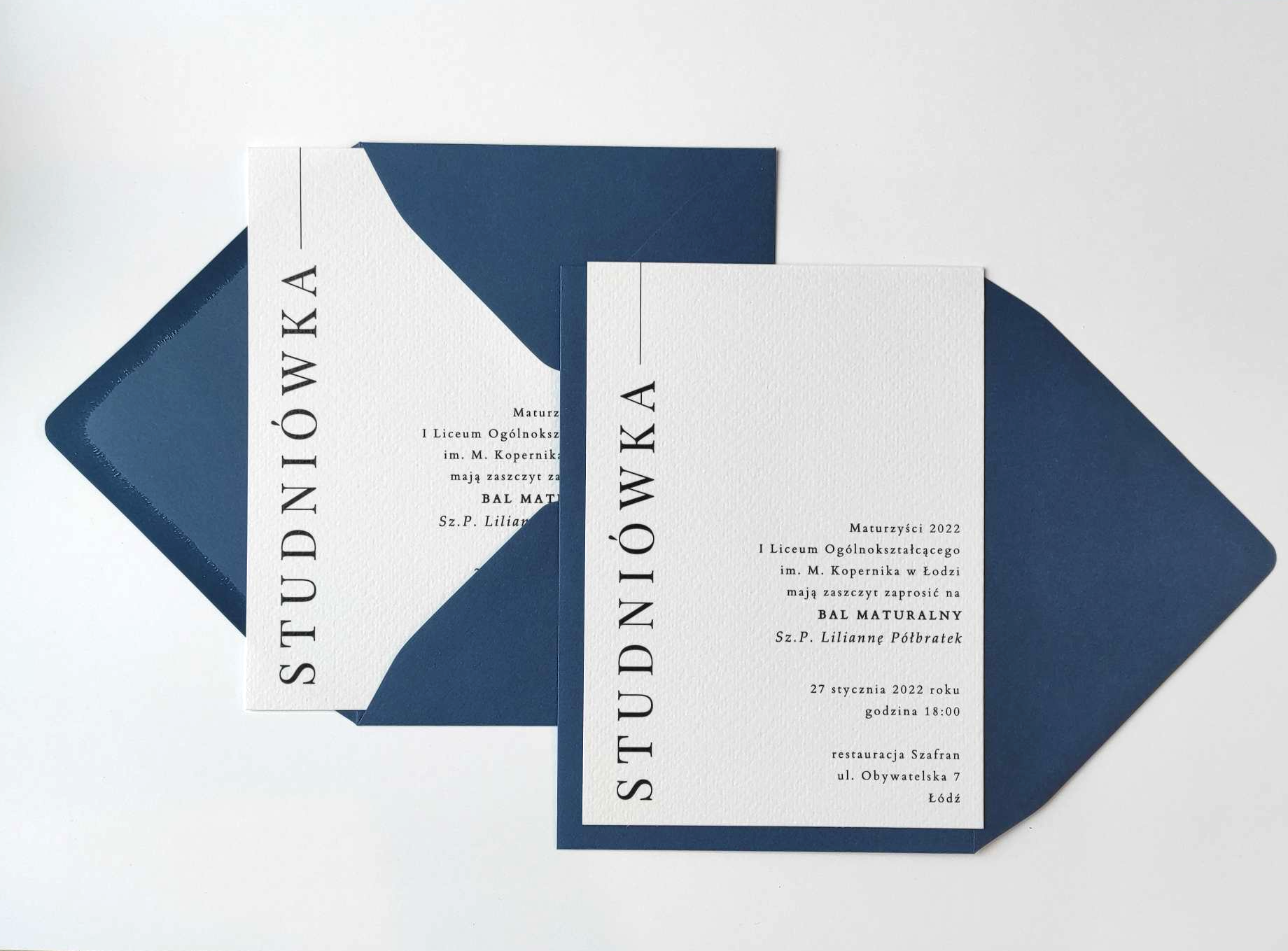 Wymiary naszych nowoczesncyh zaproszeń na studniówkę to 17 cm wysokości, 12 cm szerokości. Pasujące koperty mają format b6 i dostępne są w naszym sklepie